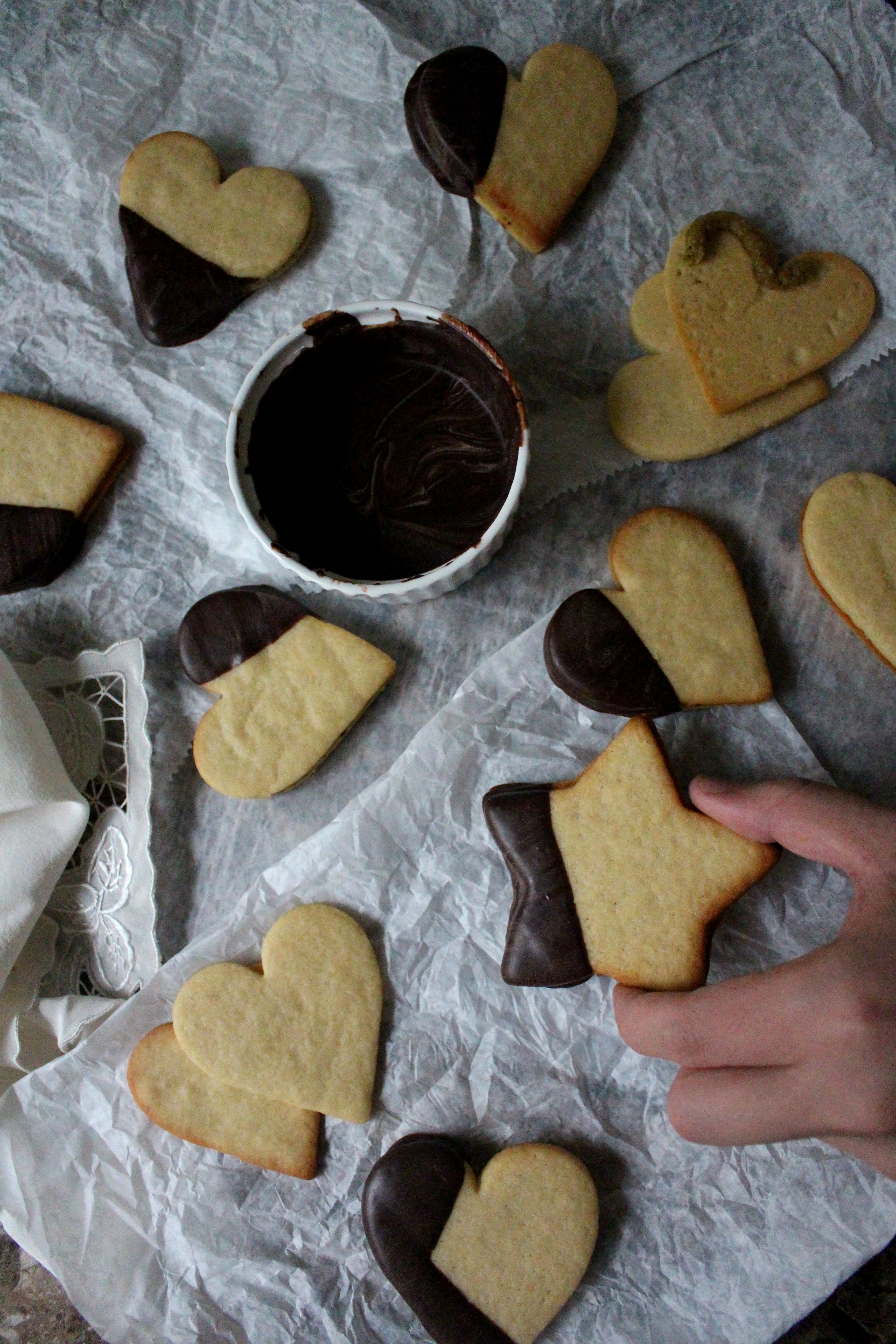 Carefully melt dark/semi-sweet chocolate in a small deep dish (good for dipping), along with 1 teaspoon of almond oil (to help smooth the chocolate). I used the microwave method, but double boiler also works. Dip cookies halfway in chocolate & garnish with powdered sugar or other embellishments if so desired. Serve & enjoy!