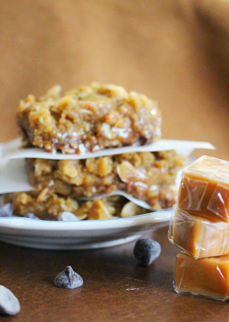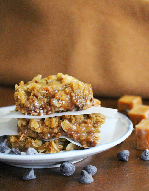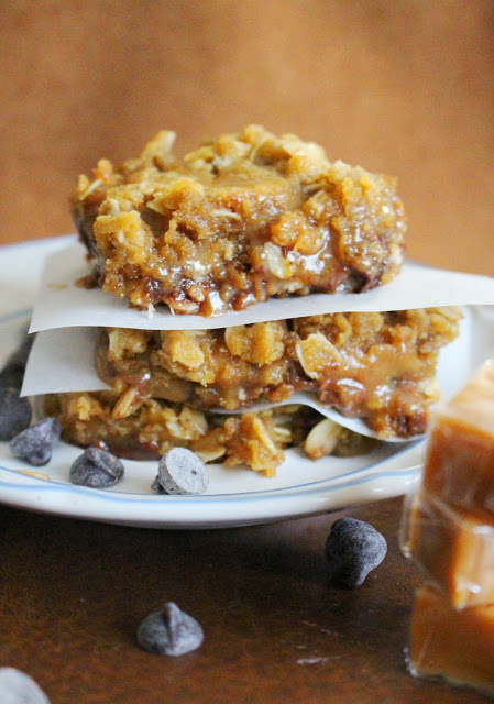 Remove pan from oven and sprinkle chocolate chips over crust. Pour caramel sauce over chocolate chips. Then crumble the remaining oatmeal mixture over the caramel layer.