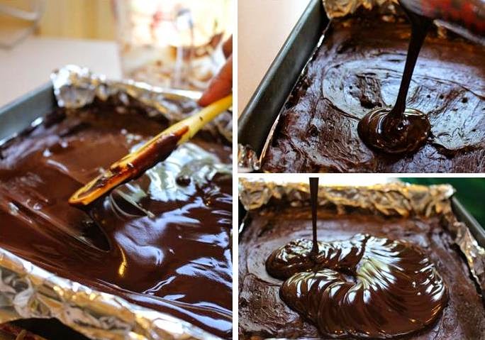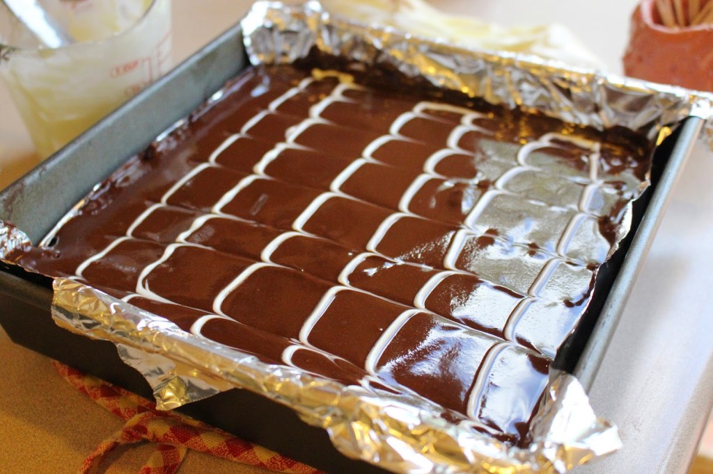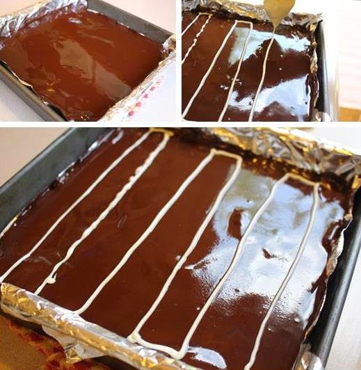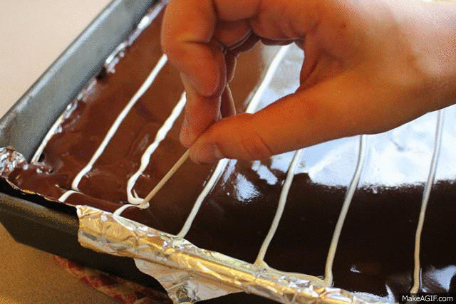 Melt the white chocolate, snip a small hole on the corner of a zip lock bag and fill it with the melted chocolate. Pipe across the chocolate ganache in horizontal rows from top to bottom. Use a toothpick and drag vertically through the lines of white chocolate (see photos). Refrigerate for at least 4 or 5 hours, but preferably overnight for best results (: