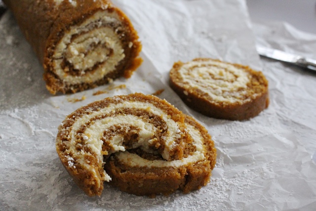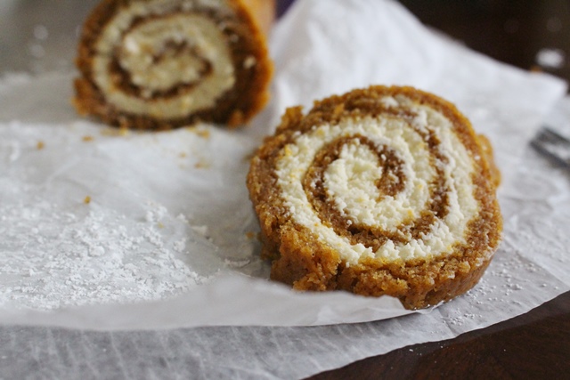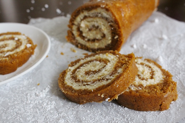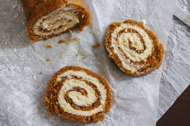 In a separate bowl, thoroughly beat sugar and eggs (2 minutes). Add pumpkin, then fold in dry ingredients. Do not overmix. Pour into pan and smooth into an even layer. Bake for 13 – 15 minutes, until top of cake springs back when lightly pressed. Run a knife around the sides of the pan to loosen the cake.